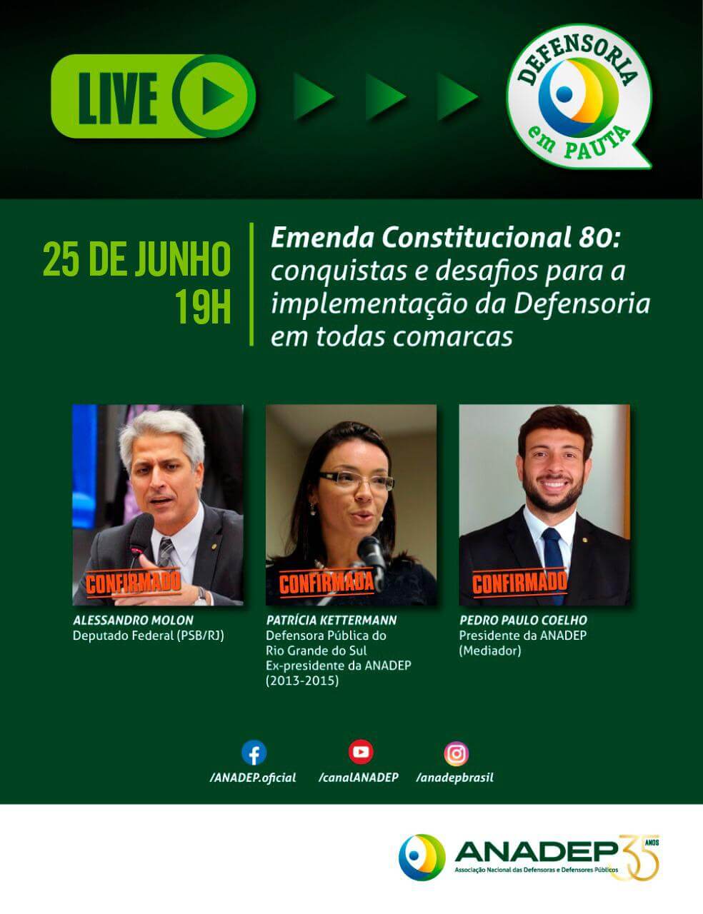 Na próxima quinta-feira (25/6), a partir das 19hs, a ANADEP promoverá o webinário "Emenda Constitucional 80: conquistas e desafios para a implementação da Defensoria em todas comarcas”. O evento virtual faz parte do novo projeto da entidade denominado "Defensoria em Pauta", que visa reforçar a imagem institucional da Defensoria Pública e ressaltar a importância da instituição para o acesso à justiça.