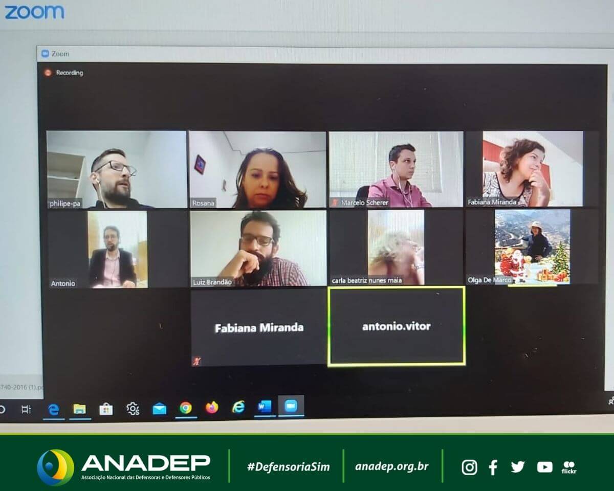 Participaram da reunião, a coordenadora da Comissão, Fabiana Almeida (BA), as defensoras e defensores públicos Antonio Vitor Barbosa (PR), Carla Beatriz Nunes (RJ), Luiz Brandão (MT), Olga Lemos (MS), Marcelo Scherer (SC), Rosana Monteiro (MT), e Philipe Arapia (GO).