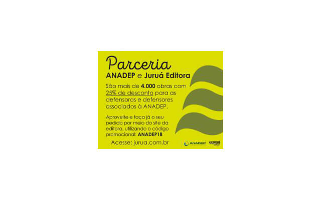 Quem tiver interesse basta acessar o sitewww.jurua.com.br ou ligar na televendas (41) 3352-1200 e usar o código promocional ANADEP18. A editora oferece várias opções de títulos e formas de pagamento!