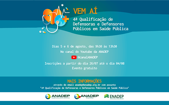 A Associação Nacional das Defensoras e Defensores Públicos (ANADEP), a Escola Nacional das Defensoras e Defensores Públicos do Brasil (ENADEP) e a Comissão de Saúde promoverão a 4ª Qualificação de Defensoras e Defensores Públicos em Saúde Pública. O evento acontecerá nos dias 5 e 6 - de 09h30 às 13h30 - e será transmitido no canal da ANADEP no Youtube (@canalANADEP).