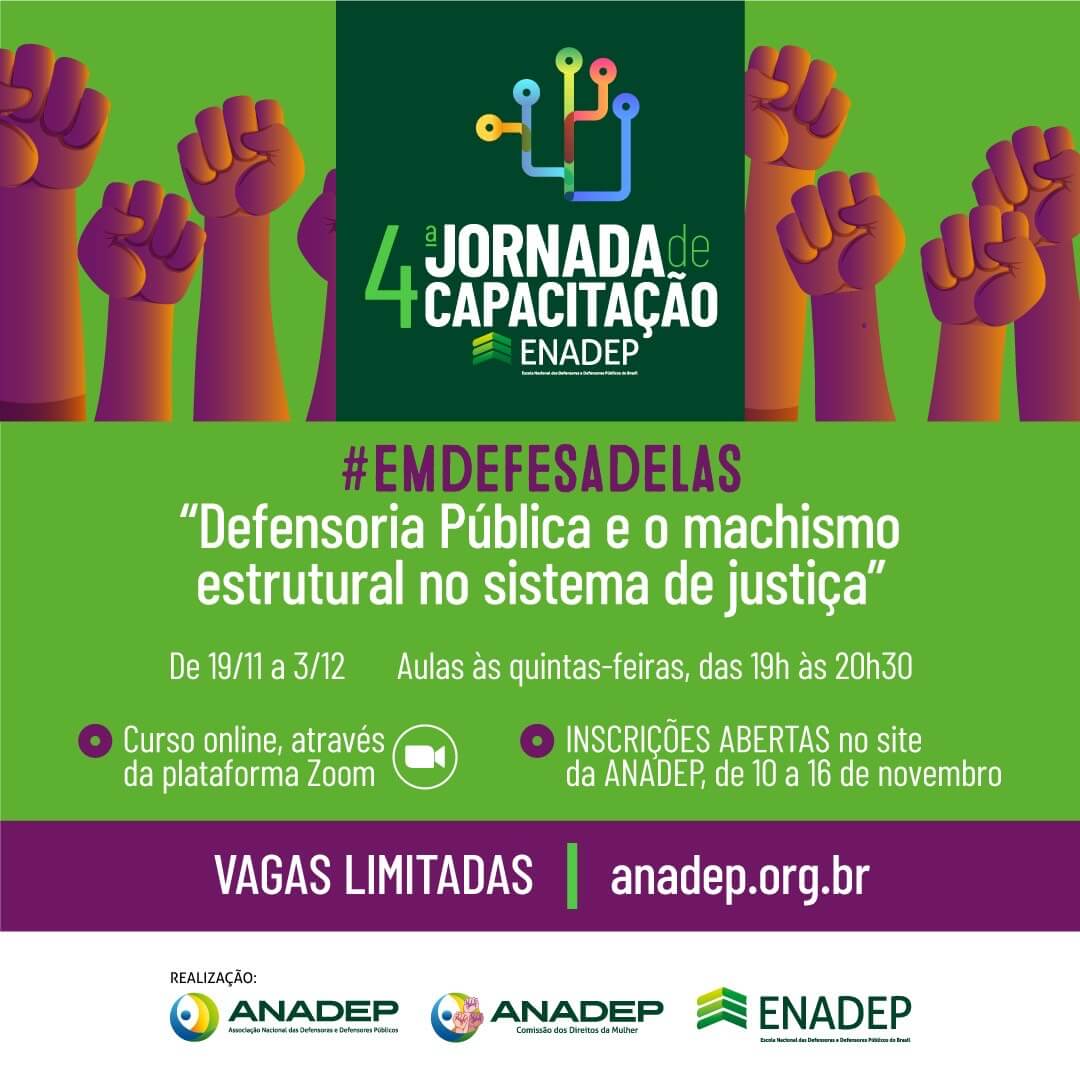 A Associação Nacional das Defensoras e Defensores Públicos (ANADEP), a Escola Nacional das Defensoras e Defensores Públicos (ENADEP) e a Comissão dos Direitos da Mulher, lançam, nesta terça-feira (10), edital para a IV Capacitação ENADEP, com a temática "Defensoria Pública e o machismo estrutural no sistema de justiça", a ser realizado via zoom.