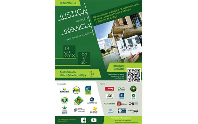 O seminário é uma iniciativa conjunta da Vara da Infância e da Juventude do Distrito Federal (VIJ-DF), da Associação Brasileira dos Magistrados da Infância e da Juventude (Abraminj), do Fórum Nacional da Justiça Protetiva (Fonajup), da Fundação Maria Cecília Souto Vidigal, do Instituto Alana, do Instituto Brasileiro de Direito da Criança e do Adolescente (IBDCRIA-ABMP), do Fórum Nacional dos Membros do Ministério Público da Infância e Adolescência (Proinfância) e da Rede Nacional Primeira Infância (RNPI), com o apoio do Ministério da Justiça, da Associação dos Magistrados Brasileiros (AMB), do Fórum Nacional da Justiça Juvenil (Fonajuv), do Fórum Nacional da Justiça Criminal (Fonajuc), da Fundação Bernard van Leer e do Fundo das Nações Unidas para a Infância (Unicef).