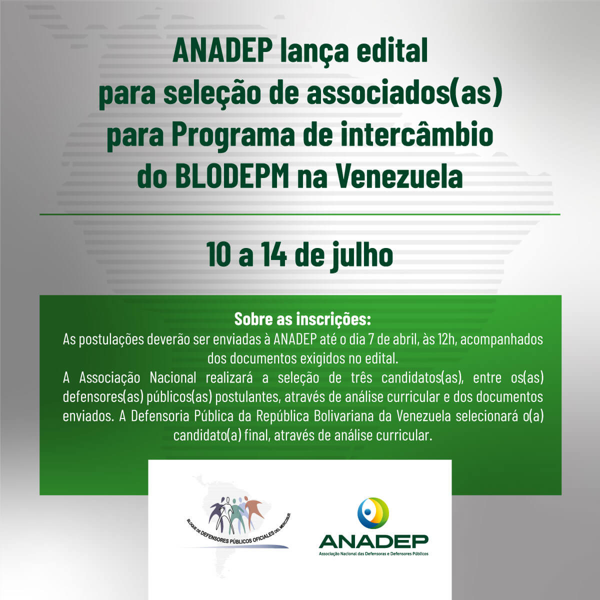 A ANADEP receberá inscrições para a seleção de 03 (três) defensoras e defensores públicos estaduais associados(as). Após esta primeira fase, uma comissão da Defensoria Pública da República Bolivariana da Venezuela definirá o(a) participantes do intercâmbio.