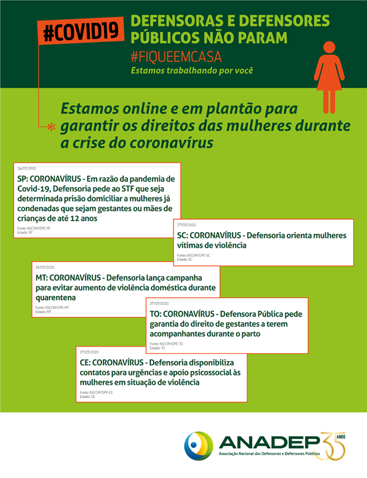Nas últimas semanas, a ANADEP e as Associações Estaduais iniciaram a campanha "Defensoras e Defensores Públicos não param". A iniciativa tem por objetivo ressaltar a atuação da categoria durante a crise provocada pelo coronavírus no Brasil. Para manter seus serviços funcionando, desde a segunda quinzena de março, a Defensoria Pública implementou o regime de plantão e o trabalho remoto para levar acesso à justiça para cidadãos durante a pandemia.