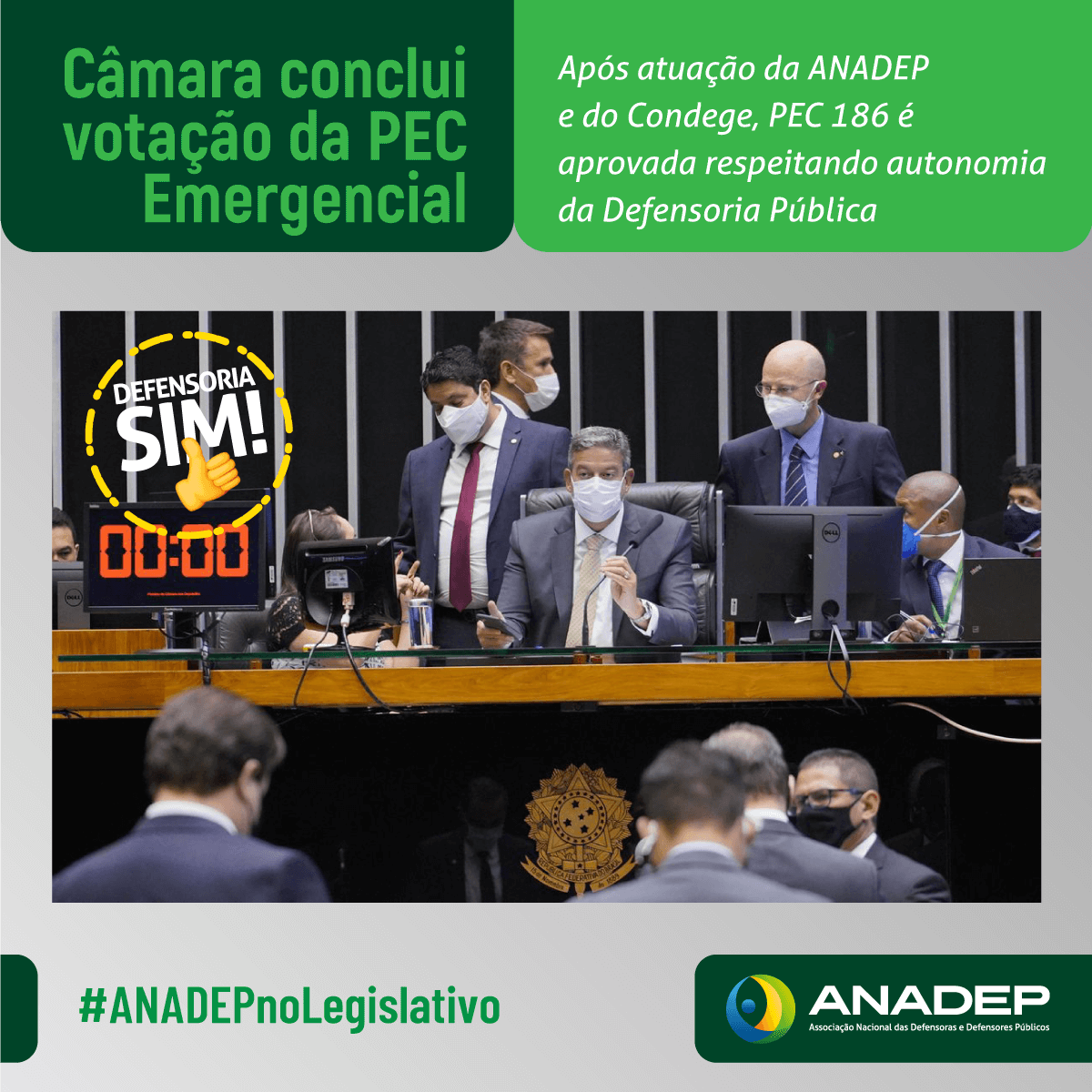 Após intensa articulação, ANADEP e CONDEGE conseguiram manter no texto as supressões e modificações obtidas no Senado que suavizam os impactos da PEC emergencial à Defensoria Pública a depender da situação fiscal de cada Estado. Na Câmara houve também a aprovação de destaque apresentado pelo Blocão que suprimiu no texto a vedação à progressão e promoção das servidoras e servidores públicos. Tal mudança beneficia servidores(as) da União, dos estados, do Distrito Federal e dos municípios, inclusive no caso de se decretar estado de calamidade pública de âmbito nacional.