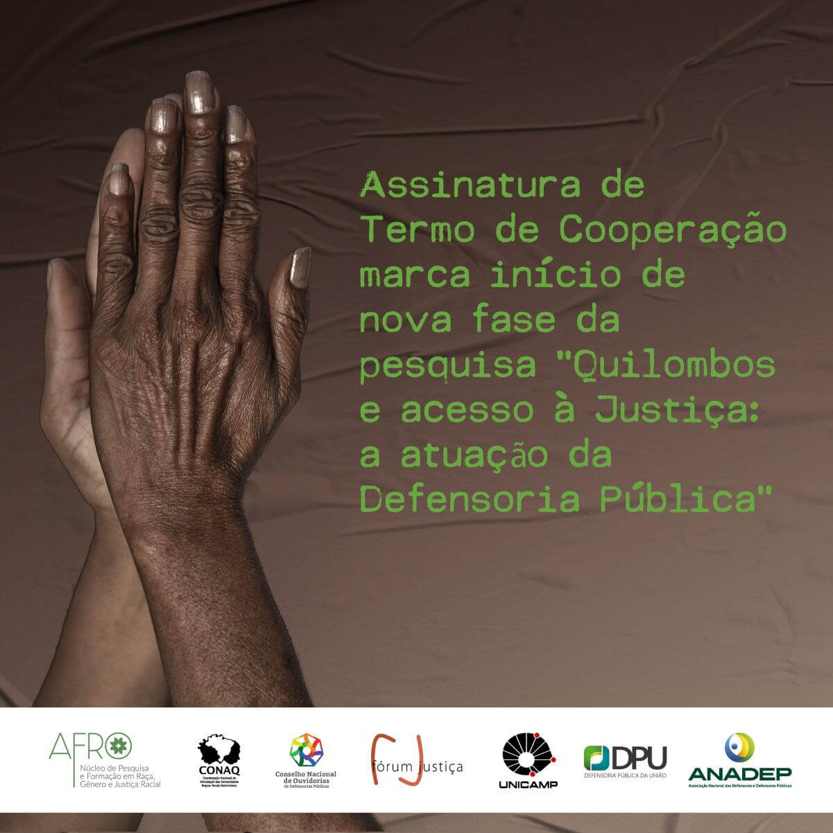 Foi assinado, neste mês de fevereiro, o termo de cooperação do projeto "Quilombos e acesso à justiça: atuação da Defensoria Pública". Estão à frente da pesquisa a ANADEP, o Fórum Justiça (FJ), a Defensoria Pública da União (DPU), o Núcleo Afro do Centro Brasileiro de Análise e Planejamento (Afro-Cebrap), a Coordenação Nacional de Articulação das Comunidades Negras Rurais Quilombolas (CONAQ) e o Conselho Nacional de Ouvidorias Externas de Defensorias Públicas do Brasil. O projeto é executado pelo LaPPA - Laboratório de Pesquisa e Extensão com Povos Tradicionais, Ameríndios e Afroamericanos do IFCH/UNICAMP.