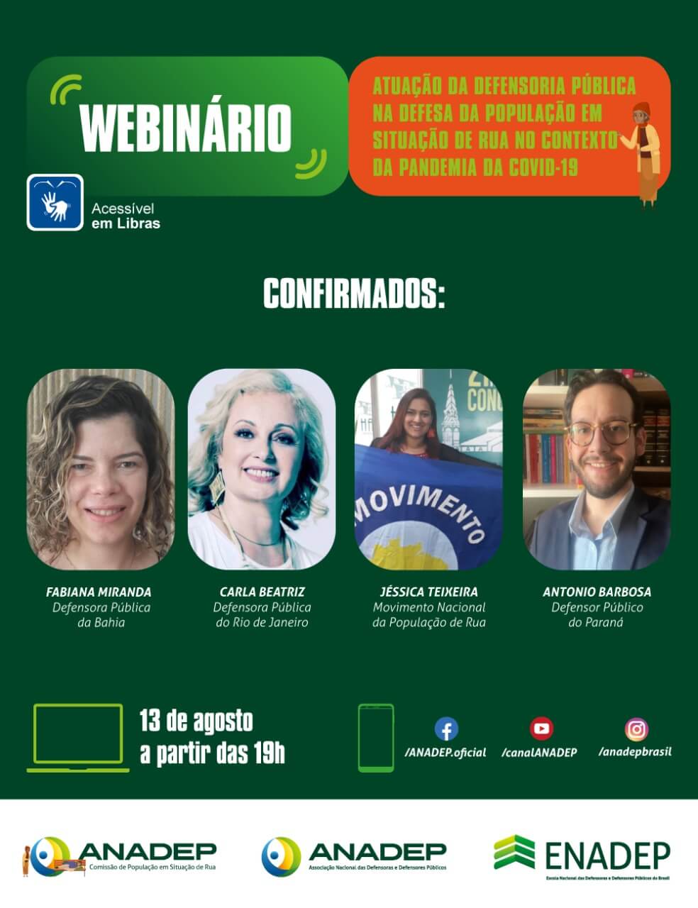 Na próxima quinta-feira (13/8), a partir das 19hs, a Comissão de População em Situação de Rua da ANADEP promoverá o webinário "Atuação da Defensoria Pública na defesa da população em situação de rua no contexto da pandemia da Covid-19". A live contará com a participação das defensoras públicas Fabiana Almeida Miranda (DPE-BA) e Carla Beatriz (DPE-RJ), além do defensor público Antonio Barbosa (DPE-PR) e da representante do Movimento Nacional da População em Situação de Rua (MNPR), Jéssica Teixeira.