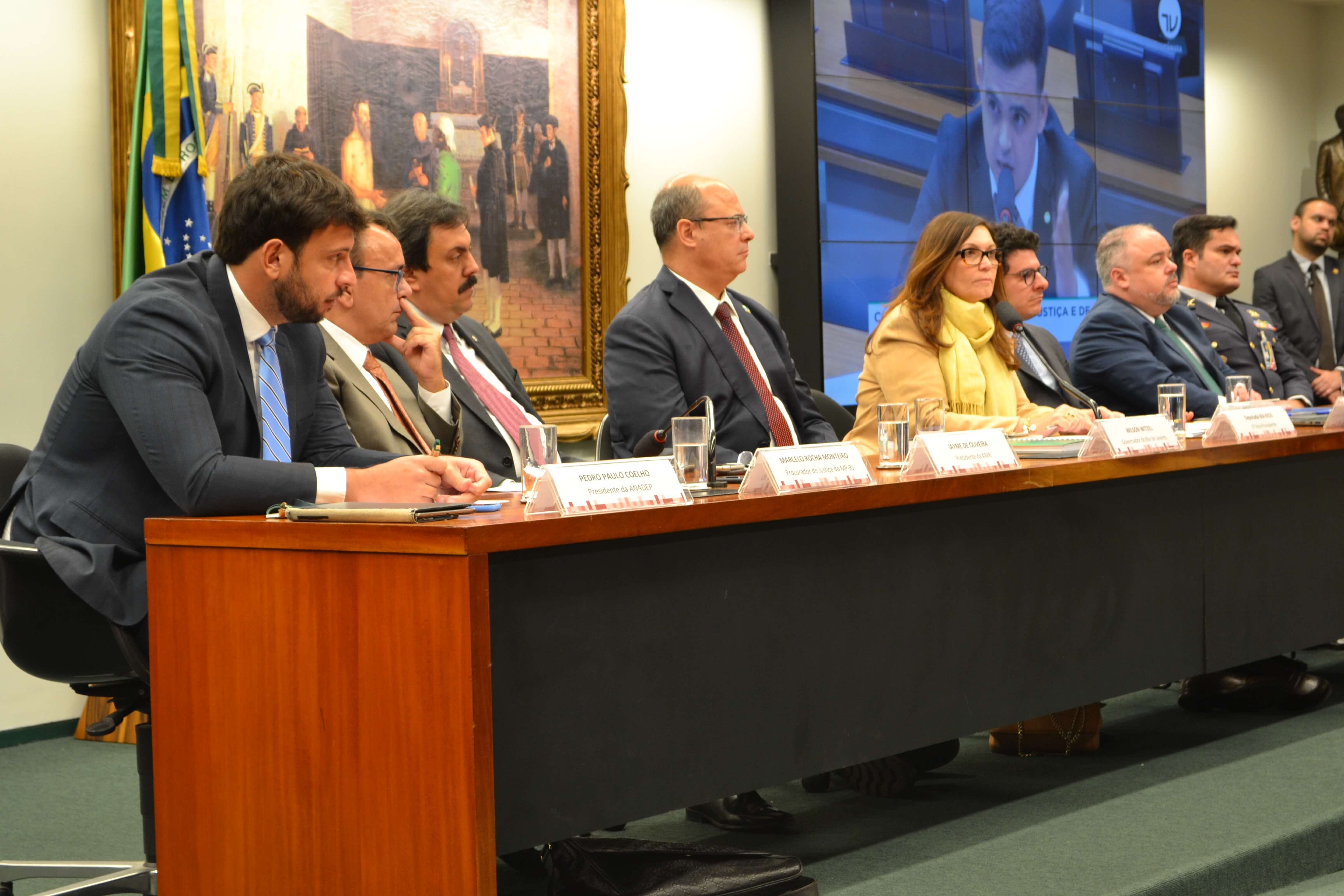 Participaram da mesa o presidente da ANADEP, Pedro Coelho; o governador do Estado do Rio de Janeiro, Wilson Witzel; o corregedor da Polícia Militar do Distrito Federal, Leonardo dos Santos; o presidente da Associação dos Magistrados Brasileiros, Jayme de Oliveira; o vice-presidente do Conselho de Segurança Pública do Rio de Janeiro, Marcelo Monteiro; e o representante do CNJ, Luís Geraldo Lanfredi.