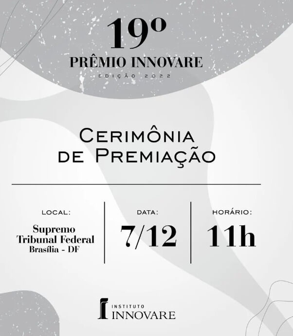 A solenidade acontecerá no dia 7 de dezembro, às 11h, no Supremo Tribunal Federal, em Brasília. O evento também poderá ser acompanhado ao vivo no canal do Youtube @premioinnovarecanal.