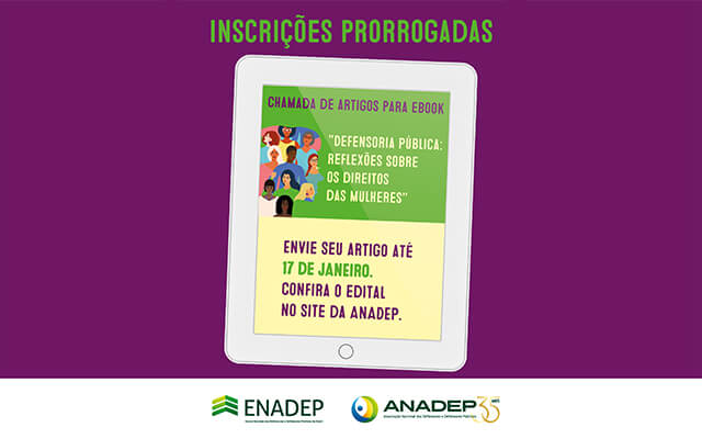 A Associação Nacional das Defensoras e Defensores Públicos, através da Escola Nacional das Defensoras e Defensores Públicos do Brasil (ENADEP), prorrogaram o envio de artigos para o e-book intitulado de “Defensoria Pública: reflexões sobre os direitos das mulheres”. O livro terá por objetivo reunir e provocar reflexões sobre a evolução dos direitos das mulheres no Brasil, além de destacar o papel exercido pela Defensoria pela efetividade deste direito.