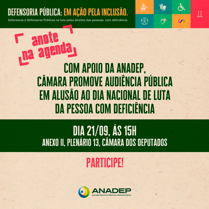 A Comissão de Defesa dos Direitos da Pessoa com Deficiência da Câmara dos Deputados promoverá no dia 21 de setembro audiência pública em comemoração ao Dia Nacional de Luta da Pessoa com Deficiência. O encontro será às 15h, na Câmara dos Deputados. A audiência foi solicitada pela ANADEP e de autoria do deputado Igor Timo (Podemos-MG).