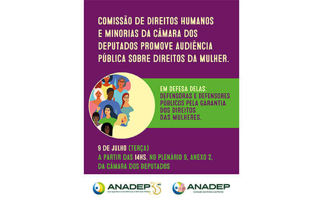 A Associação Nacional das Defensoras e Defensores Públicos (ANADEP) e a Comissão de Direitos da Mulher da ANADEP participarão, no próximo dia 9 de julho (terça-feira), a partir das 14 horas, na Comissão de Direitos Humanos e Minorias da Câmara dos Deputados, de audiência pública para falar sobre os direitos da mulher. A Associação Nacional será representada pelo presidente, Pedro Paulo Coelho, e pela coordenadora da comissão, Rita Lima. O requerimento do debate foi feito pelo deputado, Hélder Salomão (PT-ES), presidente do Colegiado.