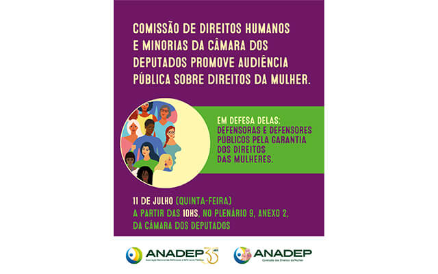 A Associação Nacional das Defensoras e Defensores Públicos (ANADEP)e a Comissão de Direitos da Mulher da ANADEP participarão, no próximo dia 11 de julho (terça-feira), a partir das 10 horas, na Comissão de Direitos Humanos e Minorias da Câmara dos Deputados, de audiência pública para falar sobre os direitos da mulher. A Associação Nacional será representada pelo presidente, Pedro Paulo Coelho, e pela coordenadora da comissão, Rita Lima. O requerimento do debate foi feito pelo deputado, Hélder Salomão (PT-ES), presidente do Colegiado.