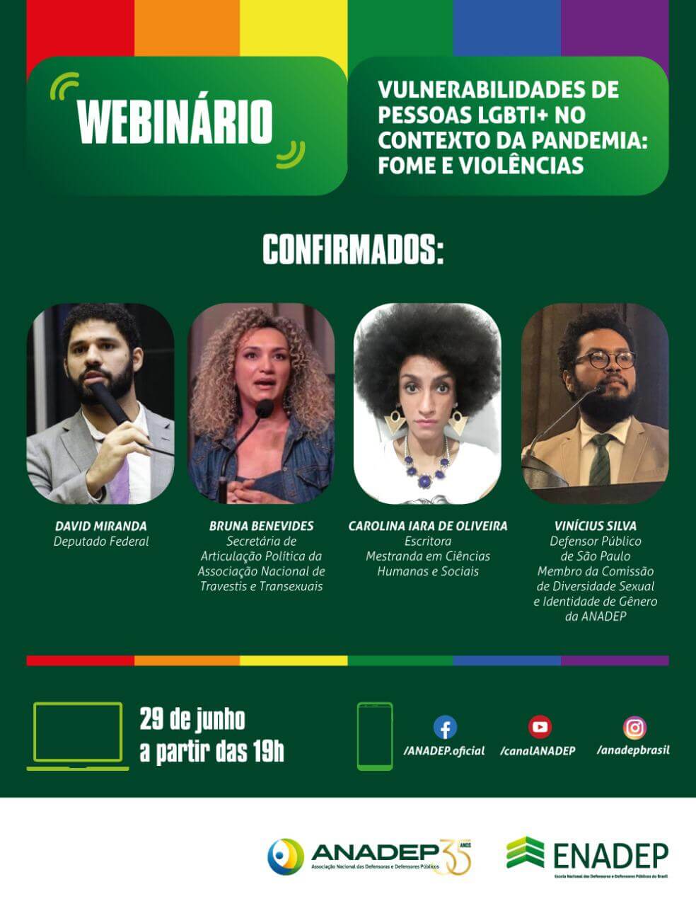 Um dos grupos mais afetados pela pandemia da COVID-19 é a população LGBTI+. Pesquisas apontam que a comunidade sofre cotidianamente com a falta de emprego formal, renda, acesso à saúde e à moradia fixa, e com o avanço da crise sanitária esses fatores se agravaram. Para discutir esse contexto, a Comissão de Diversidade Sexual e Identidade de Gênero da ANADEP realizará, no próximo dia 29 de junho, o webinário "Vulnerabilidades de pessoas LGBTI+ no contexto da pandemia: fome e violências".