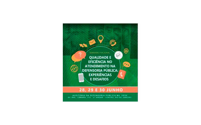 Com o objetivo de ampliar o conhecimento, aprendizagem institucional e troca de experiências acerca de projetos relacionados à qualidade e eficiência do atendimento ao público, será realizado o I Seminário Nacional "Qualidade e Eficiência na Atendimento da Defensoria Pública: Experiência e Desafios". O evento acontecerá nos dias 28, 29 e 30 de junho, no Rio de Janeiro.