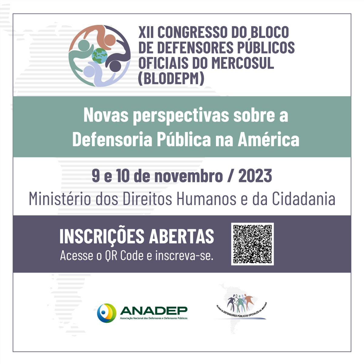 A Associação Nacional das Defensoras e Defensores Públicos (ANADEP) promoverá nos dias 9 e 10 de novembro o XII Congresso do Bloco de Defensores Públicos Oficiais do Mercosul (BLODEPM). O tema deste ano é "Novas perspectivas da Defensoria Pública na América". O encontro acontecerá no auditório do Ministério dos Direitos Humanos e Cidadania, em Brasília.
