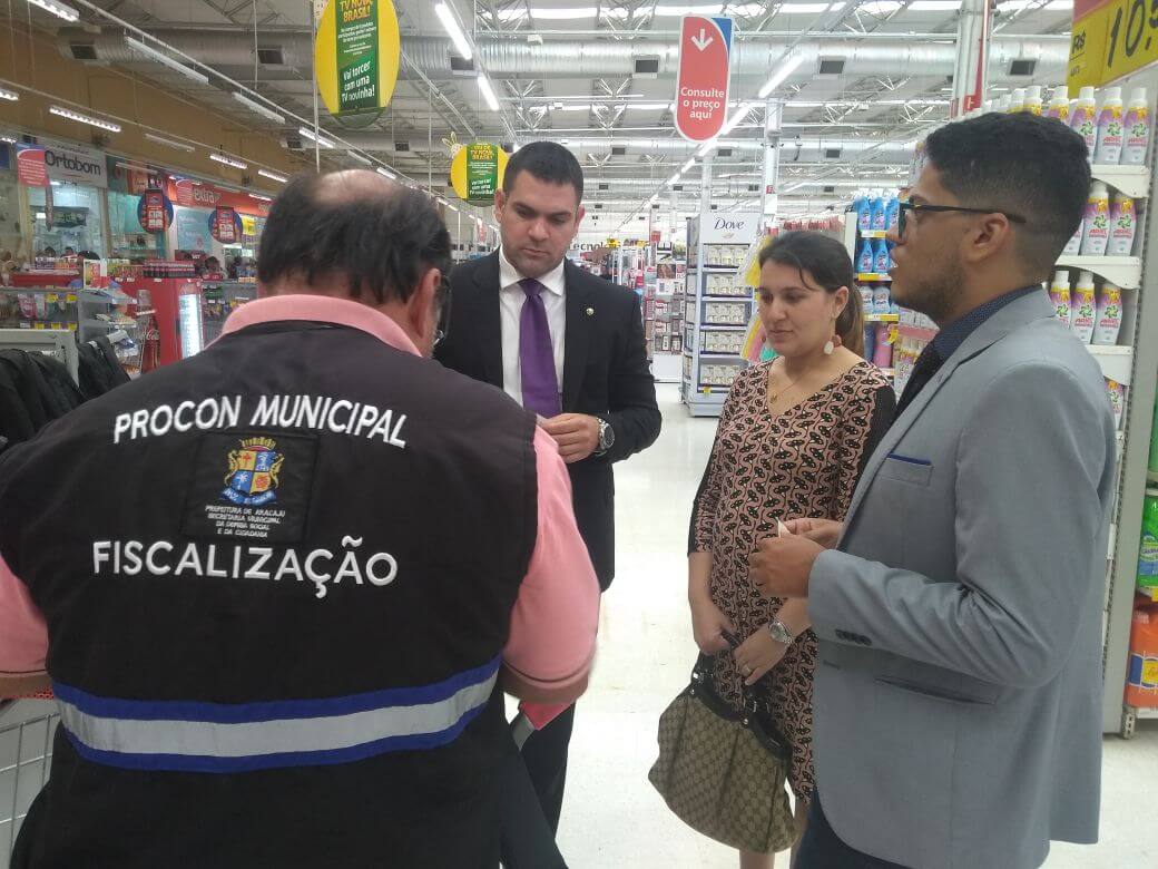 A ação foi realizada pelo coordenador de fiscalização, Francisco Costa e o assistente Kleyton Carneiro, sendo acompanhada pelos defensores públicos do Núcleo de Defesa do Consumidor (Nudecom), Rodrigo Cavalcante e Augusta Bezerra; do coordenador geral do Procon Municipal, Igor Franklin Lopes e da gerente administrativa do supermercado, Karla Gardênia.