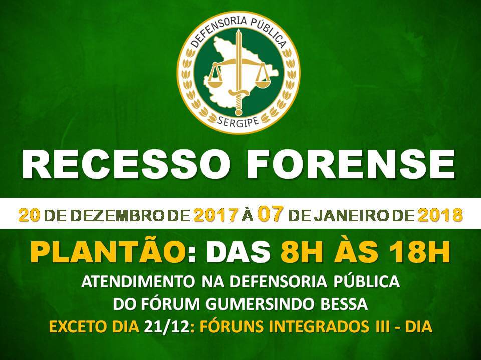 A Defensoria Pública do Estado de Sergipe entra em período de recesso forense a partir do hoje, 20, retornando os trabalhos no dia 7 de Janeiro de 2018.