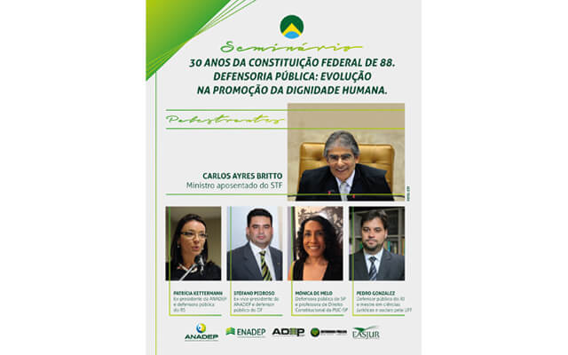 No próximo dia 5 de outubro, a Constituição Federal Brasileira completará 30 anos. A data é um marco no Estado Democrático de Direito e na garantia do acesso à Justiça por meio da Defensoria Pública. Com o objetivo de promover um resgate histórico e de discutir os avanços institucionais com a Constituição será promovido, no dia 4 de outubro, de 9hs às 18hs30, na sede da Escola da Defensoria Pública do Distrito Federal (EASJUR/DF), em Brasília, o seminário "30 anos da Constituição Federal de 88. Defensoria Pública: evolução na promoção da dignidade humana". A iniciativa é uma realização da Associação Nacional das Defensoras e Defensores Públicos (ANADEP), Escola Nacional das Defensoras e Defensores Públicos (ENADEP), Associação Nacional dos Defensores Públicos do Distrito Federal (ADEP-DF), Defensoria Pública do Distrito Federal (DPDF) e Escola de Assistência Jurídica da Defensoria Pública do Distrito Federal (EASJUR).