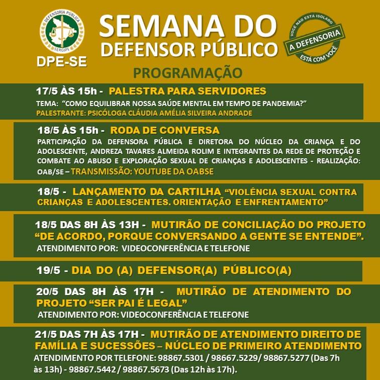 No próximo dia 19 de maio, será celebrado o Dia do Defensor Público. E para marcar a data, a Defensoria Pública do Estado de Sergipe preparou uma programação diferente em virtude da pandemia por conta do coronavírus/Covid19.