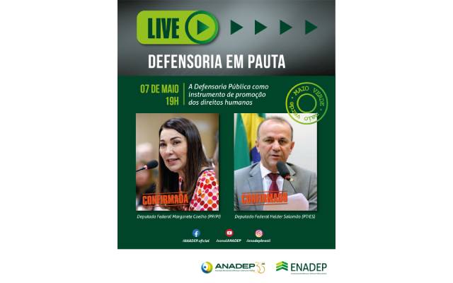 Iniciando as atividades do "Maio Verde", a ANADEP promoverá, na próxima quinta-feira (7/5), live com o presidente da Comissão de Direitos Humanos e Minorias da Câmara dos Deputados, o deputado Helder Salomão (PT/ES), e com a deputada Margarete Coelho (PP-PI). A live será às 19hs nas redes sociais da ANADEP (Facebook, Instagram e Youtube).