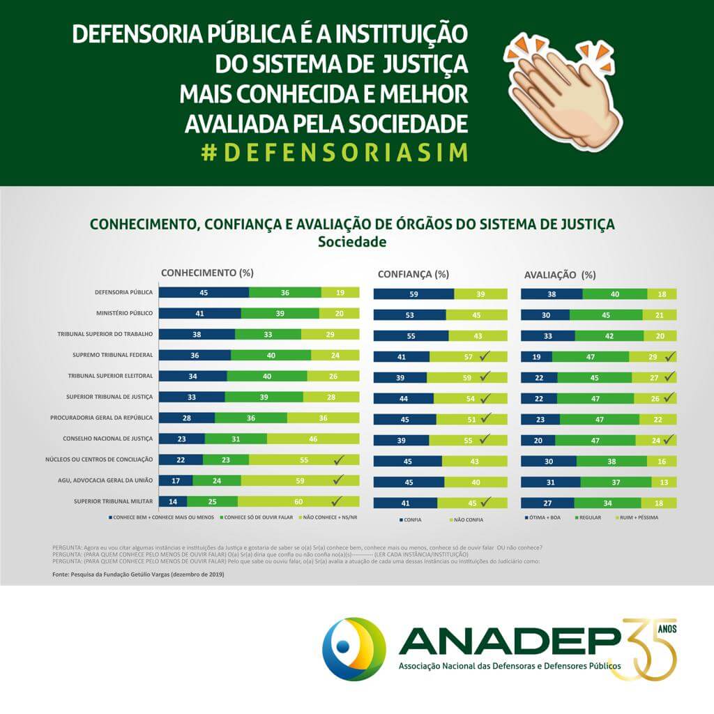 Um dos destaques do estudo são os dados referentes à Defensoria Pública. Das instituições do sistema de justiça, a instituição é conhecida por 45% dos entrevistados. É também apontada como a entidade que inspira mais confiança, de acordo com 59% das pessoas que responderam ao questionário. Por fim, 78% avaliaram a atuação da Defensoria como ótima, boa e regular.
