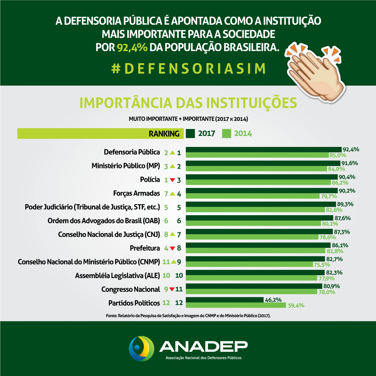Sobre a pesquisa: Foram ouvidos 5.035 brasileiros com mais de dezesseis anos em 170 municípios, incluindo todas as capitais do país, entre os dias 9 de março e 29 de maio de 2017. O trabalho foi realizado pela empresa GMR Inteligência e Pesquisa, com acompanhamento da Assessoria de Comunicação Social e da Secretaria de Gestão Estratégica do CNMP. O resumo dos indicadores avaliados abrange: conhecimento das instituições (conhece muito, conhece ou conhece pouco), importância das instituições para a sociedade (muito importante ou importante), confiança na instituição (confio muito ou confio pouco) e avaliação das instituições (ótimo ou bom). No primeiro indicador, a Defensoria é reconhecida por 68,2% dos entrevistados. Na importância, 92,4%; Confiança 74,1% e na Avaliação 55,4%.