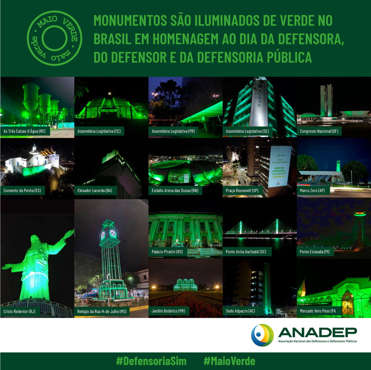 No dia 19 de maio, monumentos de várias cidades do país ganharam a iluminação na cor verde para marcar o Dia Nacional da Defensoria Pública e Dia Nacional da Defensora Pública e do Defensor Público. A Ação também marcou mais uma fase da Campanha Nacional "ONDE HÁ DEFENSORIA, HÁ JUSTIÇA E CIDADANIA". Lançada oficialmente no início do mês, em Brasília, a Campanha visa mostrar que a Defensoria Pública é referência para o acesso à justiça e garantia de cidadania às pessoas em situações de vulnerabilidades.