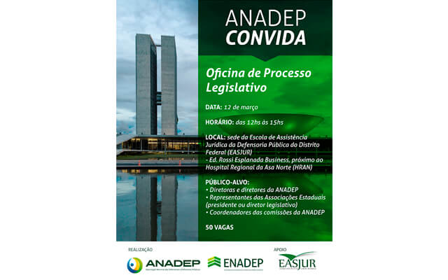 O ano de 2019 trará vários desafios para as atividades legislativas da ANADEP e das Associações Estaduais. Dessa forma, a ANADEP e a Escola Nacional das Defensoras e Defensores Públicos do Brasil (ENADEP) promoverão, no dia 12 de março (segunda-feira), de 12hs às 15hs, em Brasília, a Oficina de Processo Legislativo. A atividade terá como objetivo trazer aos(às) diretores(as) e representantes das associações estaduais as questões técnicas do processo legislativo federal e do regimento interno das Casas, bem como o panorama do trabalho que será desenvolvido nos próximos meses.