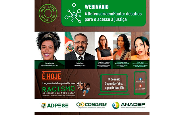 A live contará com a participação da presidenta da ANADEP, Rivana Ricarte; da presidenta do Condege, Maria José de Nápolis; da coordenadora da Comissão Temática da Igualdade Étnico-Racial da ANADEP, Clarissa Verena; do senador Paulo Paim (PT-RS); e da deputada Talíria Petrone (PSOL-RS).