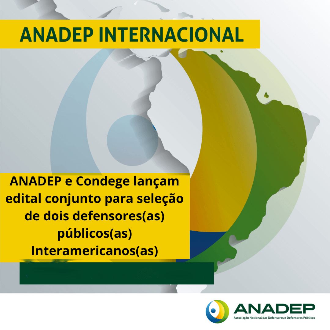 A Associação Nacional das Defensoras e Defensores Públicos (ANADEP) e o Conselho Nacional de Defensores Públicos Gerais (CONDEGE) lançaram, nesta quinta-feira (20), o edital conjunto para seleção de 2 (dois) Defensores(as) Públicos(as), que serão indicados(as) para participar de seleção junto à Associação Interamericana de Defensorias Públicas (AIDEF) para ocupar um dos 6 novos cargos para integrar o corpo de Defensores(as) Públicos(as) Interamericanos(as), para um mandato de 1 ano (complementar do atual grupo de DPIs, cujo mandato vai de 2019 a 2022) e assim representar e exercer a defesa legal de vítimas hipossuficientes, que não possuam representação legal perante a Corte Interamericana de Direitos Humanos.