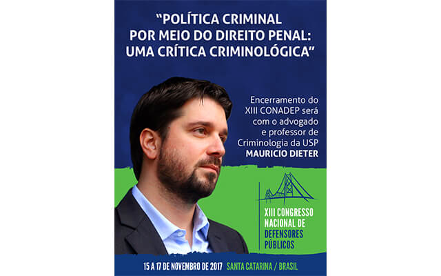 "Política Criminal por meio do Direito Penal: uma crítica criminológica" será o tema central da palestra de encerramento do XIII Congresso Nacional de Defensores Públicos, que ocorrerá de 15 a 17 de novembro, no Costão do Santinho, em Florianópolis (SC). O painel será ministrado pelo advogado criminalista, professor de Criminologia e Direito Penal da Faculdade de Direito da Universidade de São Paulo, Mauricio Dieter. Realizado a cada dois anos, o Congresso é o maior evento da Defensoria Pública brasileira.