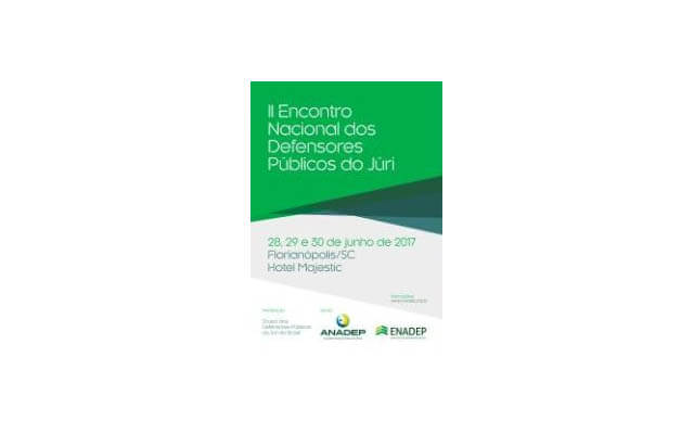 De 28 a 30 de junho, será realizado o II Encontro Nacional dos Defensores Públicos do Tribunal do Júri, no Hotel Majestic, em Florianópolis (SC). A iniciativa é do Grupo dos Defensores Públicos do Júri do Brasil e tem apoio da Associação Nacional dos Defensores Públicos (ANADEP) e da Escola Nacional dos Defensores Públicos do Brasil (ENADEP). O objetivo é debater questões atinentes ao procedimento do Tribunal do Júri, especialmente no que diz respeito ao Plenário, de modo a garantir a verdadeira plenitude de defesa.