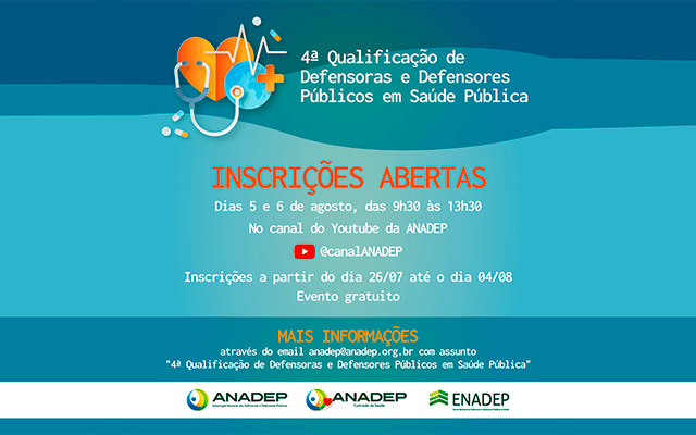 A Associação Nacional das Defensoras e Defensores Públicos (ANADEP), a Escola Nacional das Defensoras e Defensores Públicos do Brasil (ENADEP) e a Comissão de Saúde promoverão a 4ª Qualificação de Defensoras e Defensores Públicos em Saúde Pública. O evento acontecerá nos dias 5 e 6 - de 09h30, às 13h30 - e será transmitido no canal da ANADEP no Youtube (@canalANADEP).