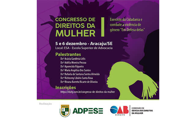 "Em Defesa Delas". Esse é o tema do  Congresso Direito da Mulher, que será promovido pela ADPESE e a OAB/SE, nos dias 5 e 6 de dezembro, na Esa - Escola Superior de Advocacia. Proposto pela Associação Nacional das Defensoras e Defensores Públicos, o tema será apresentado por diversos palestrantes.