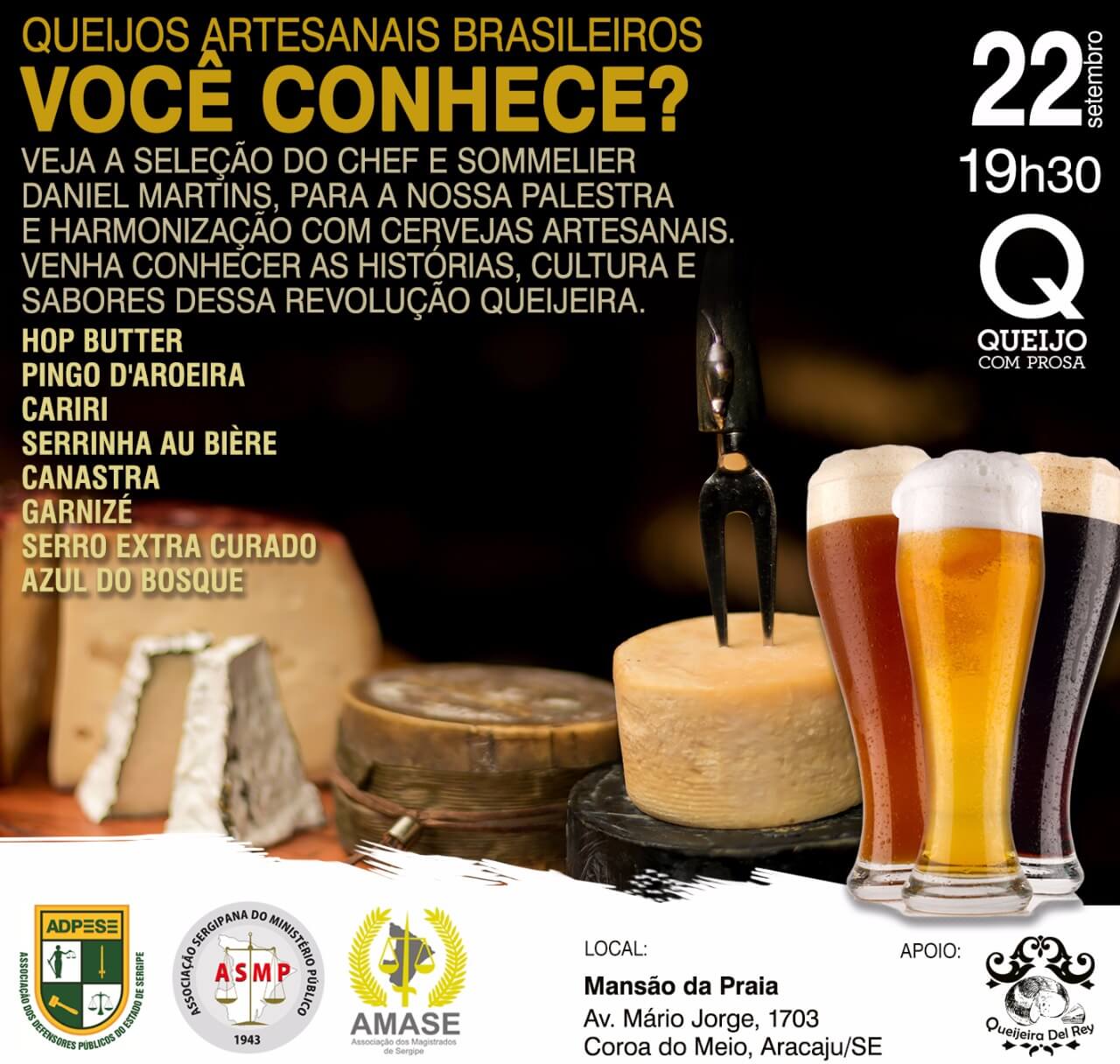 A Associação dos Defensores Públicos do Estado de Sergipe (Adpese), a Associação Sergipana do Ministério Público (ASMP) e a Associação dos Magistrados de Sergipe (Amase) se juntam em mais uma iniciativa voltada à integração de seus associados e promovem uma Palestra sobre Queijos Brasileiros e Harmonização com Cervejas Artesanais. Sob o comandado do Chef, mestre queijeiro e cervejeiro, Daniel Martins, o evento ocorrerá no dia 22 de setembro, às 19h30, no Espaço Mansão da Praia Eventos, situado na Av. Mário Jorge Menezes Vieira, 1703, Bairro Coroa do Meio. Cada Associação terá direito a 10 vagas. As inscrições serão realizadas na sede da Adpese, até o dia 18 de setembro, ao custo de R$ 70. Não serão feitas reservas e a participação será garantida mediante pagamento. As vagas destinam-se exclusivamente aos associados, sendo abertas aos dependentes apenas em caso de não preenchimento.