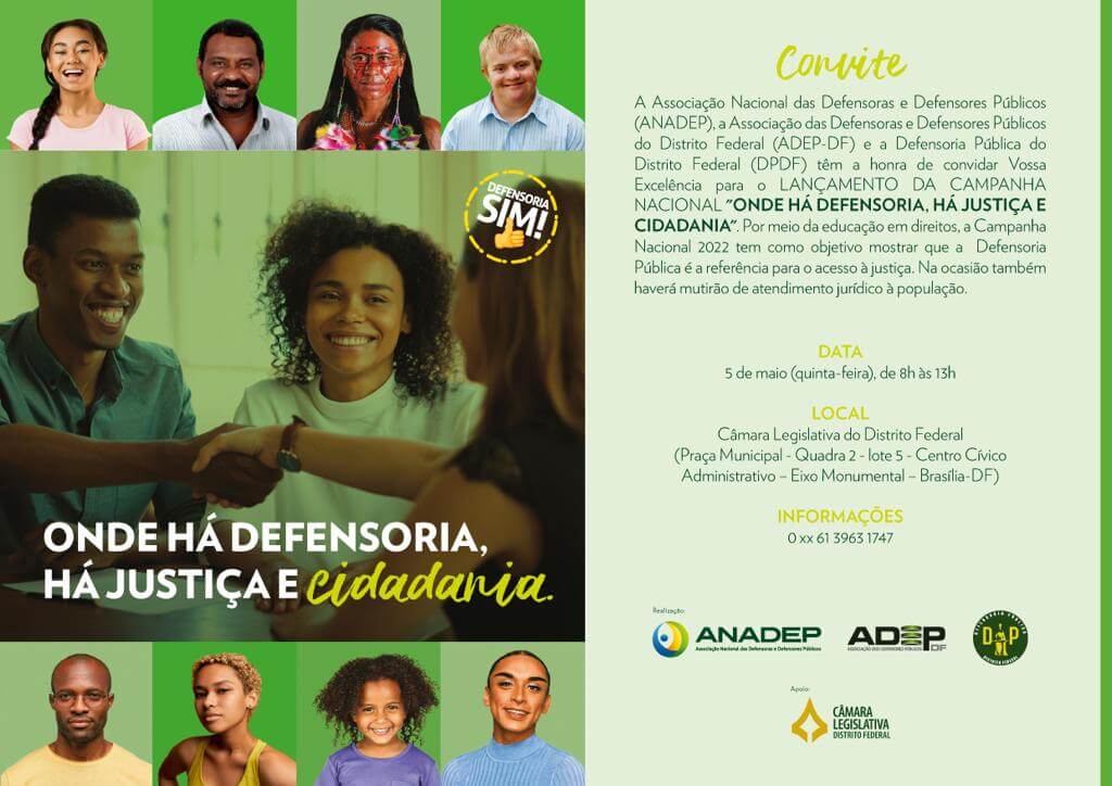 No próximo dia 5 de maio (quinta-feira), a Associação Nacional das Defensoras e Defensores Públicos (ANADEP) e a Associação das Defensoras e Defensores Públicos do Distrito Federal (ADEP-DF) lançarão a Campanha Nacional "ONDE HÁ DEFENSORIA, HÁ JUSTIÇA E CIDADANIA". A ação contará com um grande mutirão de atendimento jurídico, de 8h às 13h, no pátio da Câmara Legislativa do Distrito Federal (CLDF), na área central de Brasília. Na ocasião, defensoras e defensores públicos prestarão orientação jurídica e vão esclarecer dúvidas da população.