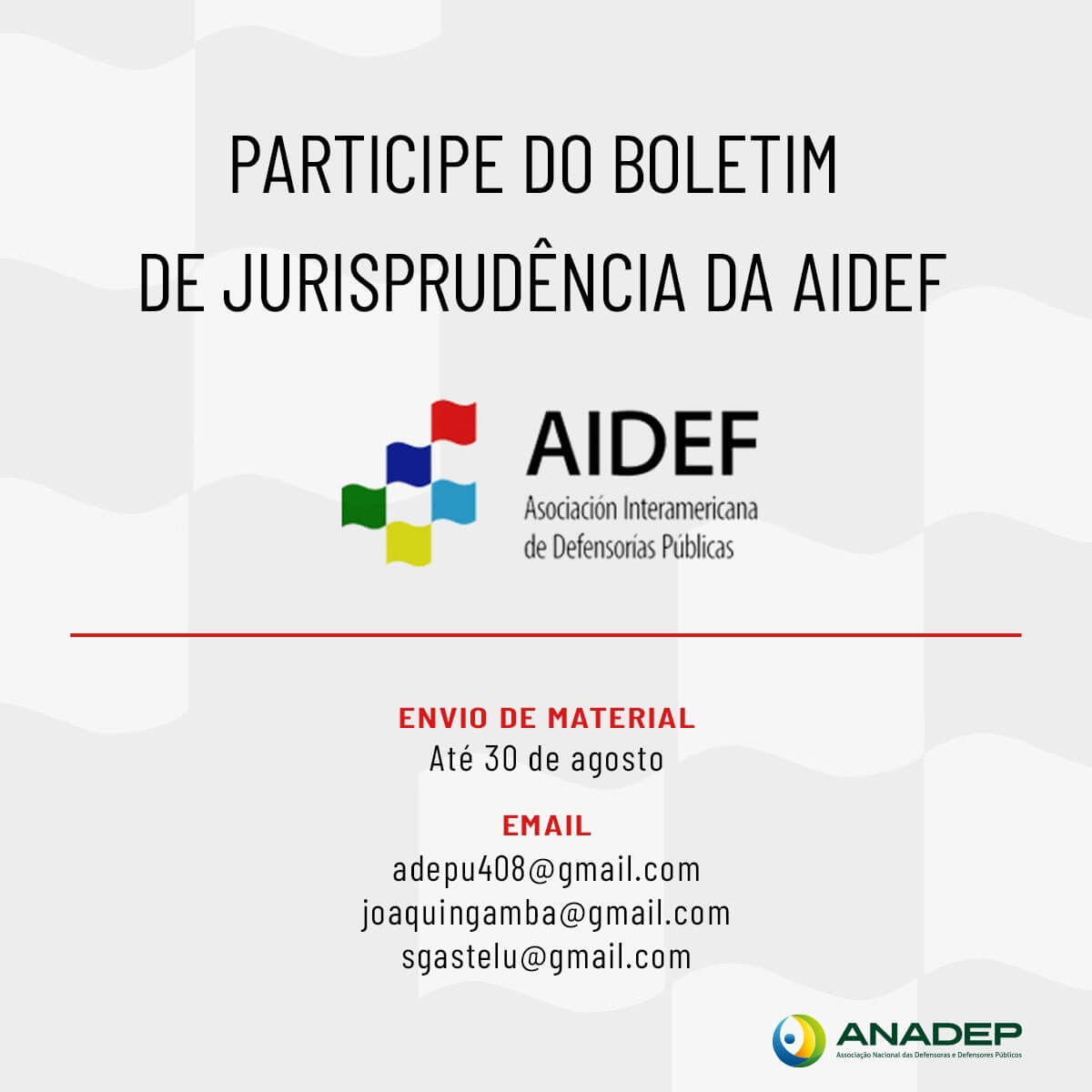 Os(as) associados (as) da ANADEP interessados(as) podem encaminhar material para o email até o dia 30 de agosto para os seguintes emails: adepu408@gmail.com || joaquingamba@gmail.com || sgastelu@gmail.com