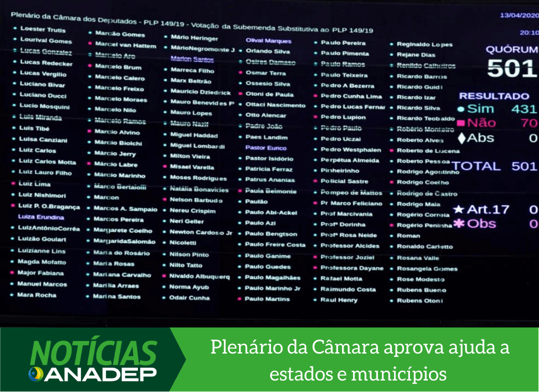 O plenário da Câmara dos Deputados aprovou, nesta segunda-feira (13/4), por 431 votos a 70, o PLP 149/19, substitutivo do deputado Pedro Paulo (DEM-RJ) ao projeto conhecido como Plano Mansueto. A proposta prevê ajuda financeira da União a estados, Distrito Federal e municípios para o enfrentamento à pandemia de covid-19. Entre as iniciativas previstas estão a compensação da queda de arrecadação do Imposto de Circulação, Mercadorias e Serviços (ICMS) e do Imposto sobre Serviços (ISS) de 2020 em relação ao ano passado.