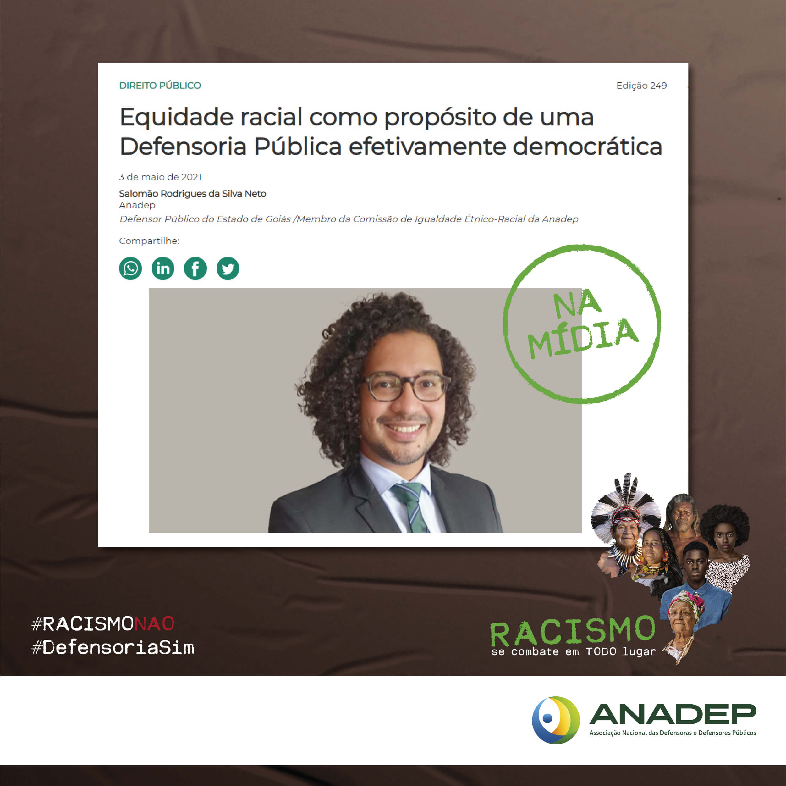 Assim, a revista Justiça & Cidadania destacou artigo do defensor público de Goiás e membro da Comissão Temática da Igualdade Étnico-Racial da ANADEP, Salomão Rodrigues. Com o título "Equidade racial como propósito de uma Defensoria Pública efetivamente democrática", o texto aborda a importância da discussão.