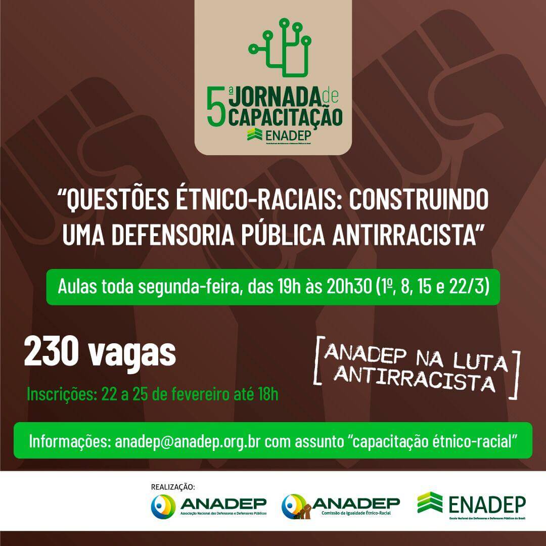 Um dos principais objetivos da nova diretoria da ANADEP é ampliar o debate acerca das questões de raça no âmbito da Defensoria Pública. A ideia é que haja mais diretrizes para equidade e paridade racial na ocupação dos espaços de poder dentro e fora da Instituição, bem como a promoção de eventos e seminários sobre o tema. Desta forma, a ANADEP, a Escola Nacional das Defensoras e Defensores Públicos do Brasil (ENADEP) e a Comissão da Igualdade Étnico-Racial promoverão a V Jornada Questões étnico-raciais: construindo uma Defensoria Pública Antirracista". Ao todo serão quatro aulas que terão início no dia 1º de março e término no dia 22/3, no aplicativo Zoom.