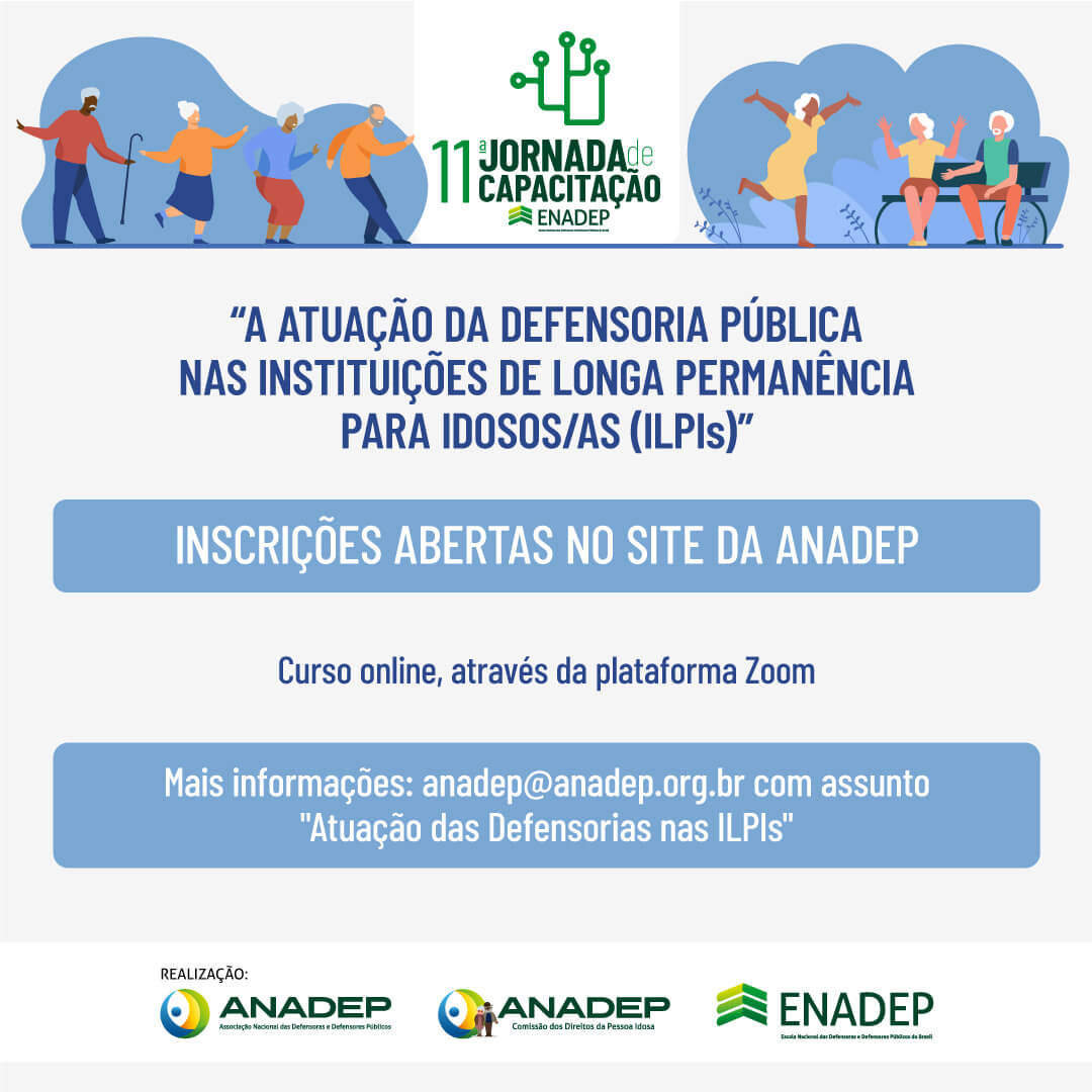 A Associação Nacional das Defensoras e Defensores Públicos (ANADEP), a Escola Nacional das Defensoras e Defensores Públicos do Brasil (ENADEP) e a Comissão dos Direitos da Pessoa Idosa promoverão a XI Jornada de Capacitação. A temática será "A atuação da Defensoria Pública nas Instituições de longa permanência para idosos(as)".