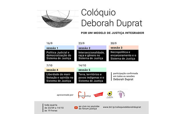 O Fórum Justiça, em parceria com as organizações Justa, Artigo 19 e Coletiva Mulheres Defensoras Públicas do Brasil, organizou, entre 16 de setembro e 14 de outubro, o Colóquio Deborah Duprat: por um modelo de justiça integrador. O objetivo dos encontro foi discutir como garantir um modelo de justiça integrador, responsivo e inclusivo que dê suporte aos direitos e que possa mantê-los, mesmo em momentos de crise político-institucional e/ou de redução de direitos conquistados. A ANADEP foi uma das apoiadoras do evento.