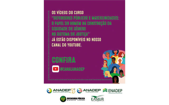 O curso “Defensores Públicos e Masculinidades: o papel do homem na construção da equidade de gênero no sistema de justiça”, promovido pela ANADEP, já está disponível no nosso canal do youtube (@canalanadep). O seminário aconteceu no dia 6 de fevereiro, na sede da Escola da Defensoria Escola de Assistência Jurídica da DPDF (Easjur), em Brasília.