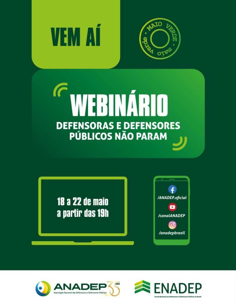 Um dos destaques do “Maio Verde” será a realização do webnário “Defensoras e Defensores Públicos não param”, de 18 a 22 de maio, às 19hs.