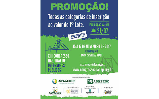 De 15 a 17 de novembro, a ANADEP e a Associação dos Defensores Públicos do Estado de Santa Catarina (ADEPESC) promoverão o XIII CONADEP. Sob o tema “Defensoria Pública: em defesa das pessoas em situação de vulnerabilidade", o evento será realizado no Costão do Santinho, em Florianópolis. O Congresso, que é o maior evento da Defensoria Pública brasileira, deve oportunizar o debate dos principais temas relacionados à Instituição e o papel da defensora e do defensor público na sociedade.